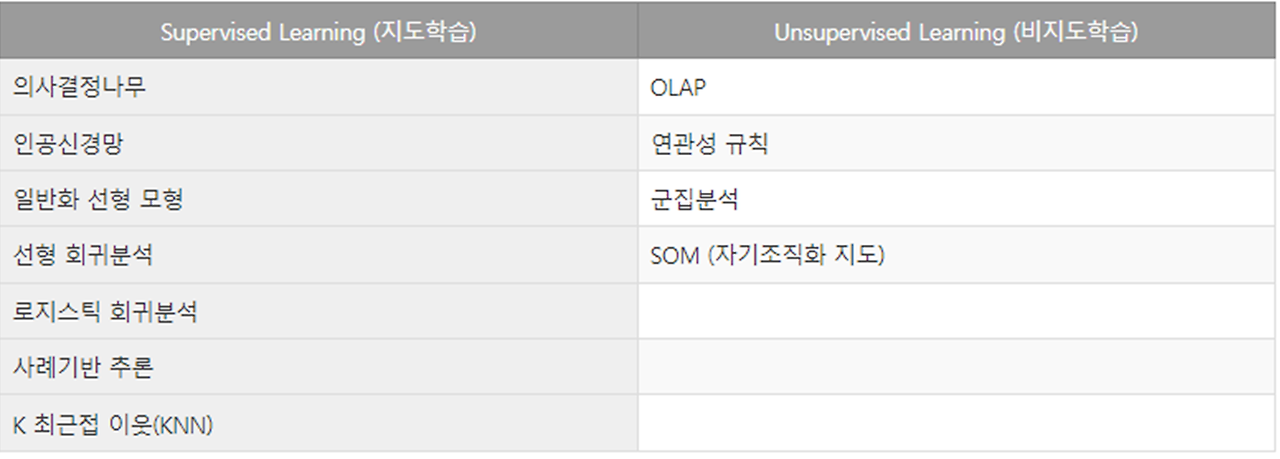 - 대표적인 고급 분석법으로 대용량의 자료로부터 정보를 요약하고 미래에 대한 예측을 목표로 자료에 존재하는 관계, 패턴, 규칙 등을 탐색하고 이를 모형화함으로써 이전에 알려지지 않은 유용한 지식을 추출하는 분석 방법