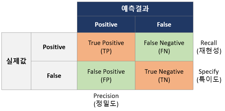 - 정밀도(Precision) : 모델의 예측값 중 정답과 일치하는 값의 비율