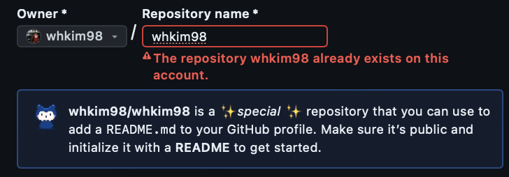 이렇게 New Repository에서 자신의 깃 로그인 아이디와 동일한 이름의 레퍼지토리를 적어주면 이런 화면이 나온다.