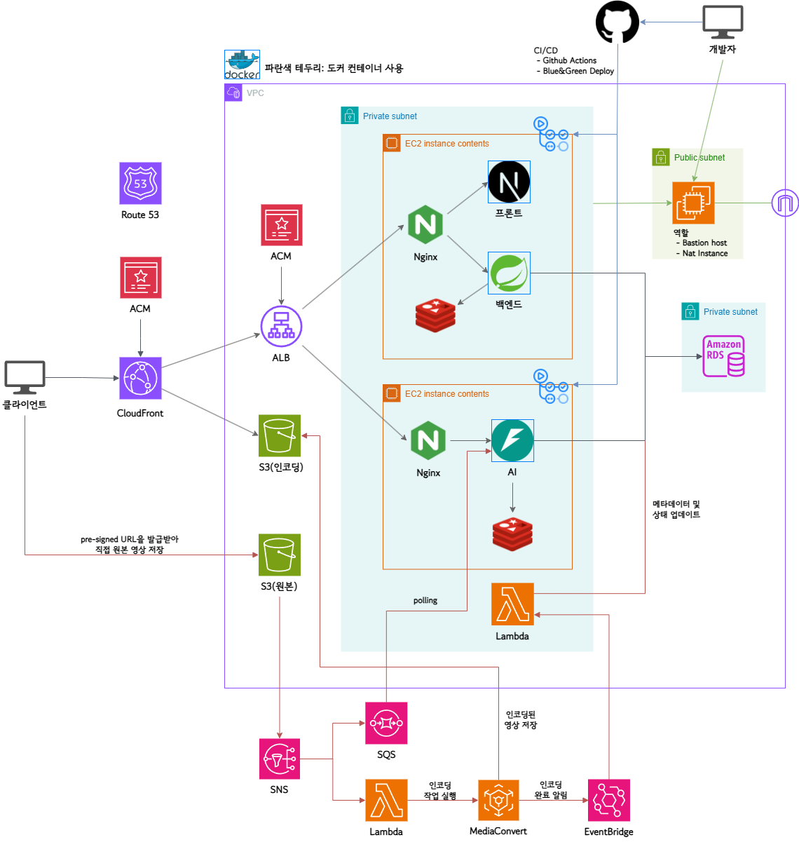 - 프론트: SSR(Next.js 등), 정적 데이터는 CloudFront + S3에서 직접 배포.