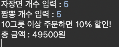 // 사용자에게 자장면, 짬뽕 주문 수량을 입력받아 결제 금액을 계산하여 출력