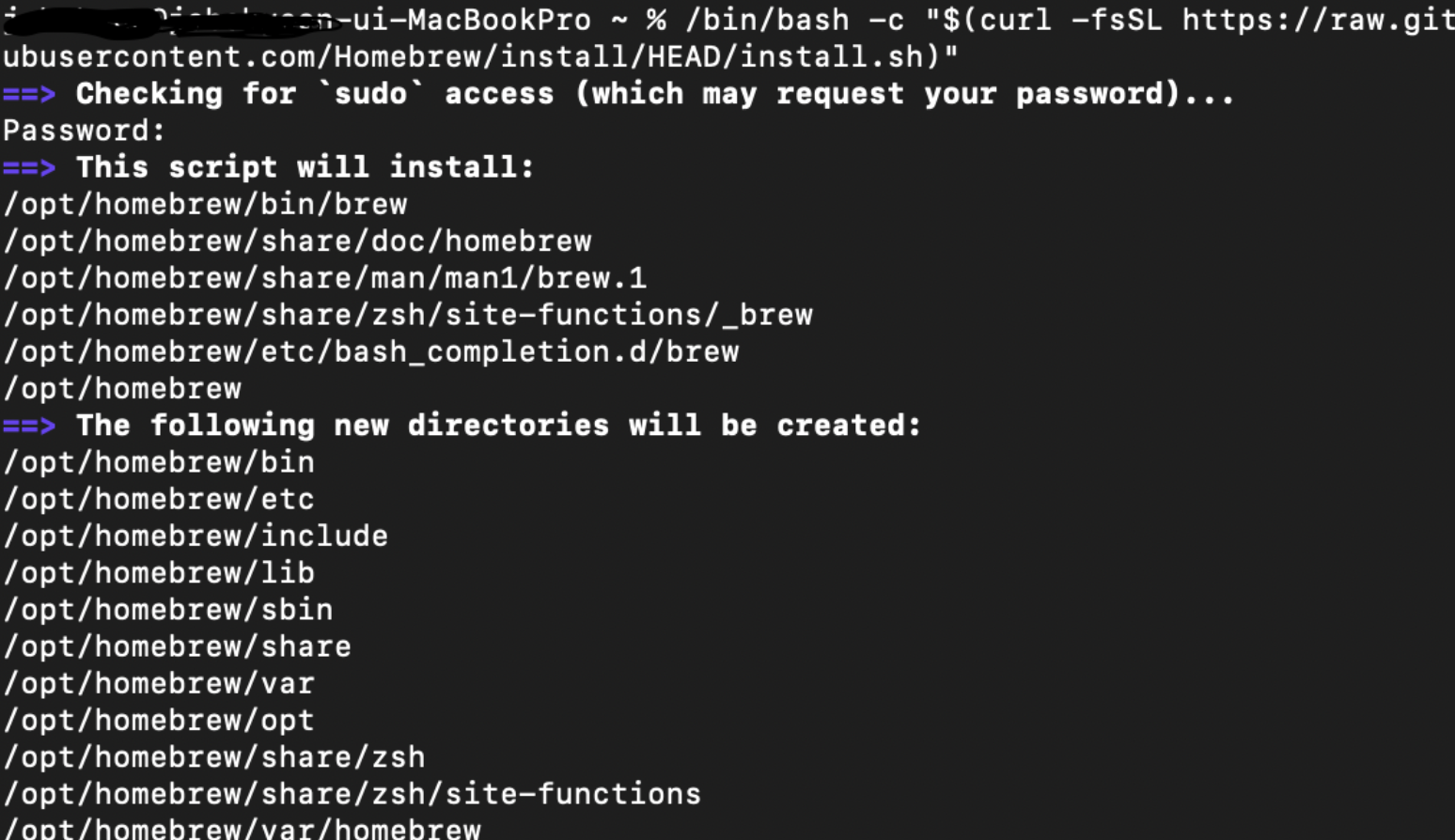 mac의 터미널 창에 붙여넣기해서 실행시켜주면 끝이다 sudo access를 하기 위해 비밀번호를 입력하라고 나와서 노트북 비밀번호를 입력해줬다