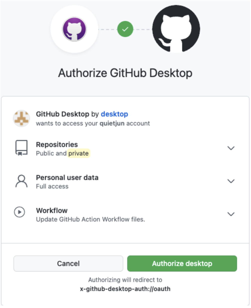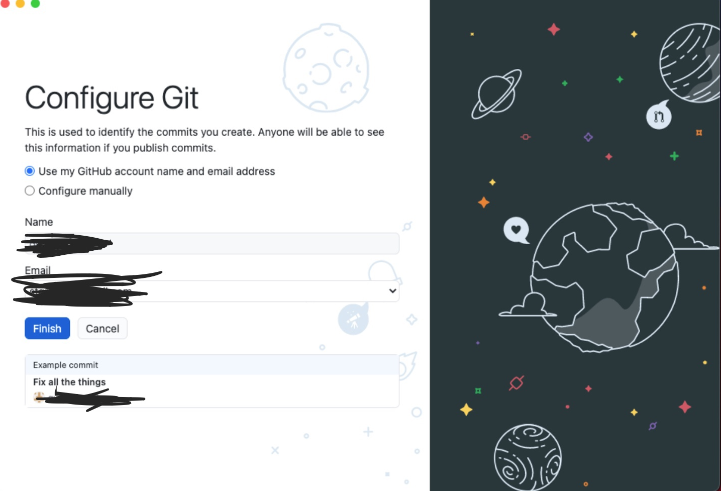 [Authorize desktop] 버튼을 눌러 권한을 주게 되면 Git 환경과 연결할 수 있도록 github의 계정 이름과 이메일을 설정할 수 있다.