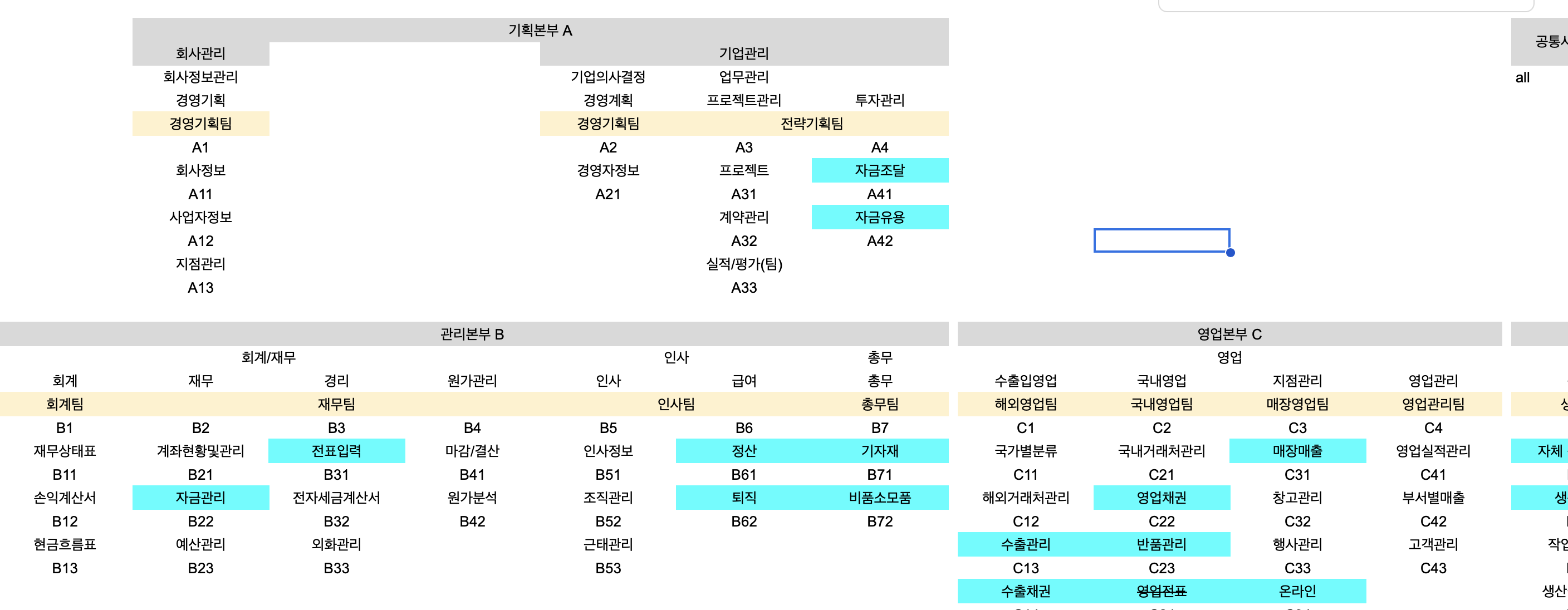 여기서 내가 맡은 역할은 재무팀에 B2파트, 인사팀 모든 기능, 해외영업팀 모든 기능, 물류팀 모든 기능을 맡았다.